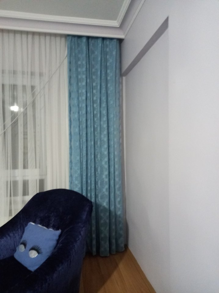 Hafif mavi renkte, modern klasik tarzda, hafif batik desenli perde, odaya yumuşak dekoratif bir dokunuş katıyor. kuşagida var