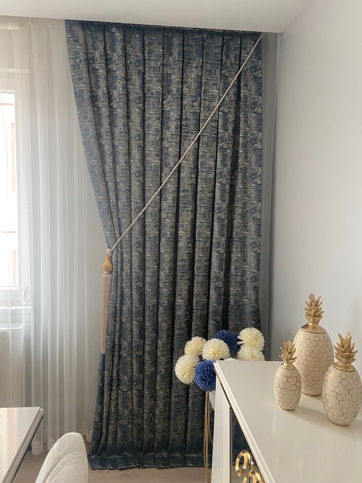 Modern klasik tarzda mavi ve gri batik desenli, dokulu ve şık görünümlü perde. 3 parçadan oluşmaktadır 120*240 ölçüleri