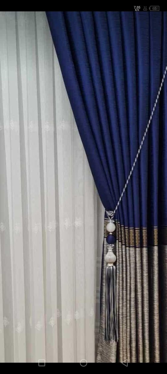 Mavi ve gri nakış detaylı modern klasik tarzda perde, dekoratif püsküllü bağlama ipi ile birlikte.