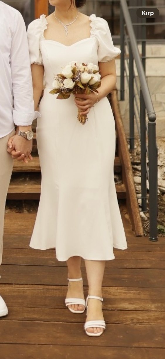 Beyaz renkli, tekne yaka ve ince askılı, vücuda oturan modern klasik tarzda midi boy gelinlik. Paris tarzını yansıtan sade ve şık bir seçim.