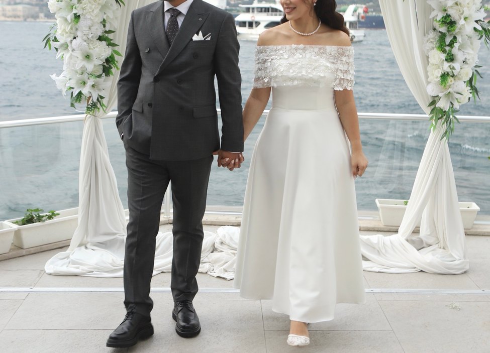 Beyaz, midi uzunlukta, straplez yaka ve omuzları açık çiçekli dantel detaylı, modern klasik tarzda, vücuda oturan elbise. 40/42 beden uyumlu, arkası korseli. Nişanımda kullandım, herhangi bir deformasyonu yoktur. Özel dikimdir. Kolları da dahildir. not: boyum 1.65 cm