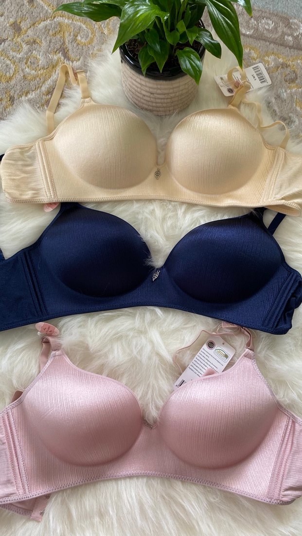 Hafif bej, lacivert ve yumuşak pembe renklerde modern klasik stilde, kendinden desenli ve rahat midi uzunlukta sütyenler. Günlük kullanım için uygundur. Çeyizlik için kesinlikle öneririm