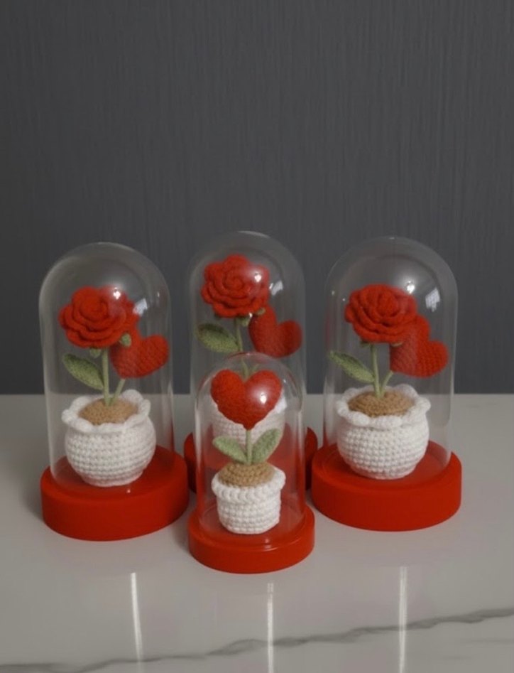 Modern klasik tarzda el yapımı süsler, kırmızı tabanlı şeffaf fanus içinde örme kırmızı güller ve kalplerle şıklık ve zarafet sunar.