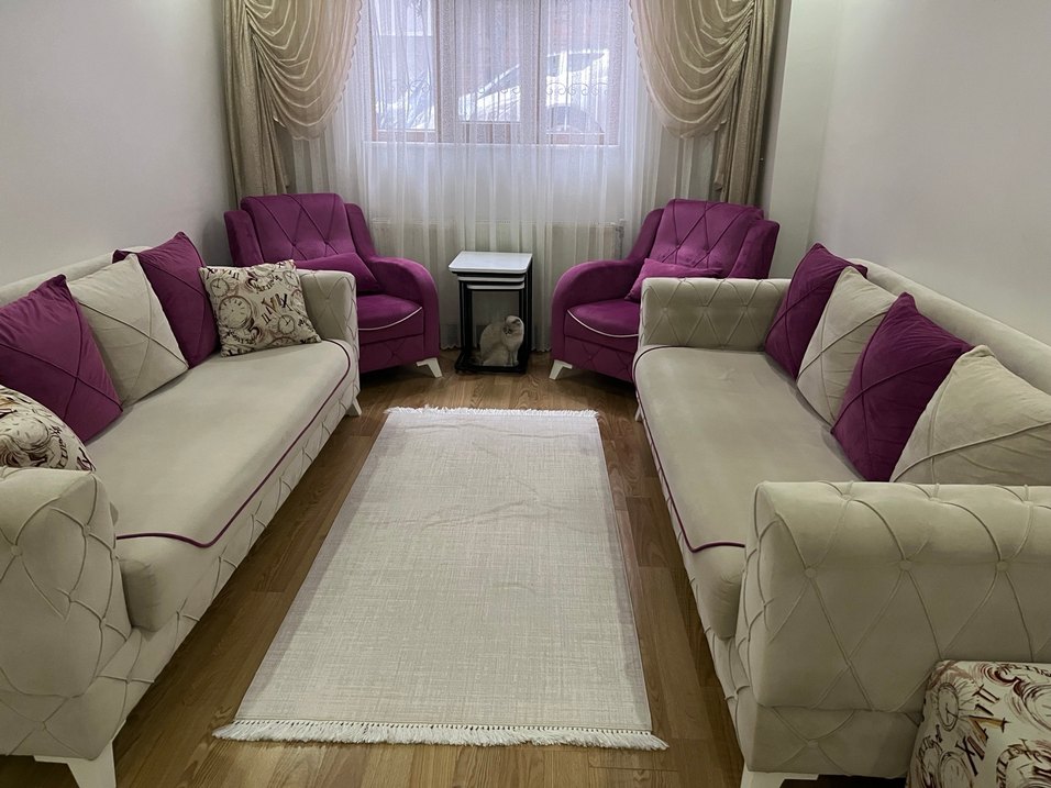 Modern klasik tarzda, düz desensiz pembe koltuk kılıfları, gri tonlu odaya uyum sağlar. ️sandıklı istanbul Gaziosmanpaşa