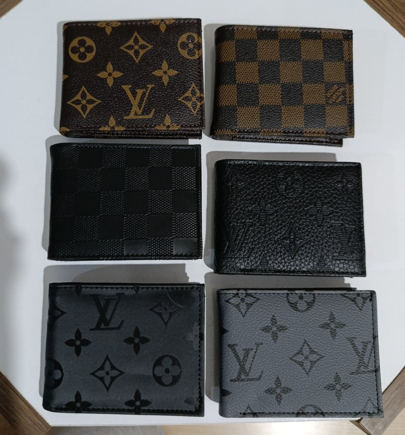 Klasik Paris tarzında, siyah ve kahverengi tonlarda dokulu desenlere sahip altı adet erkek cüzdanı seti. Modern klasik şıklığı yansıtır.