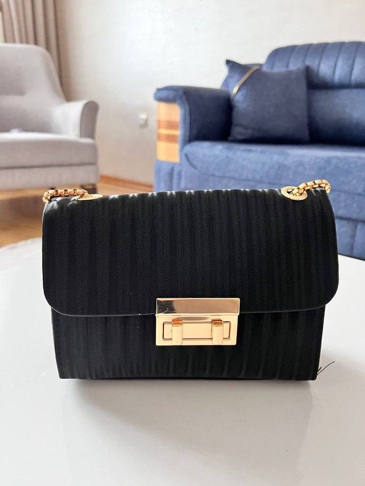 Siyah pileli kadın çanta, modern klasik tarzda, altın renkli toka ve zincir askıya sahip, sentetik kumaştan yapılmıştır. Günlük kullanım için Paris tarzı şıklık sunar.