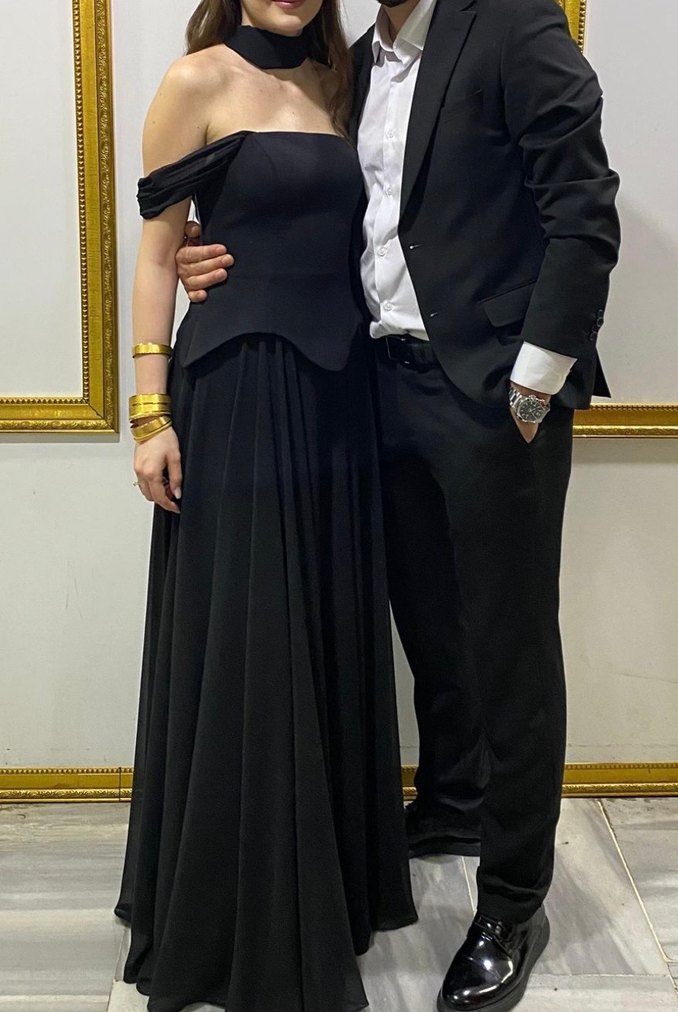 Modern klasik siyah uzun elbise düşük omuz detaylı isterseniz straplezde kullanabilirsiniz boynunda ayrı bir parçası var sadece bir kere giyildi