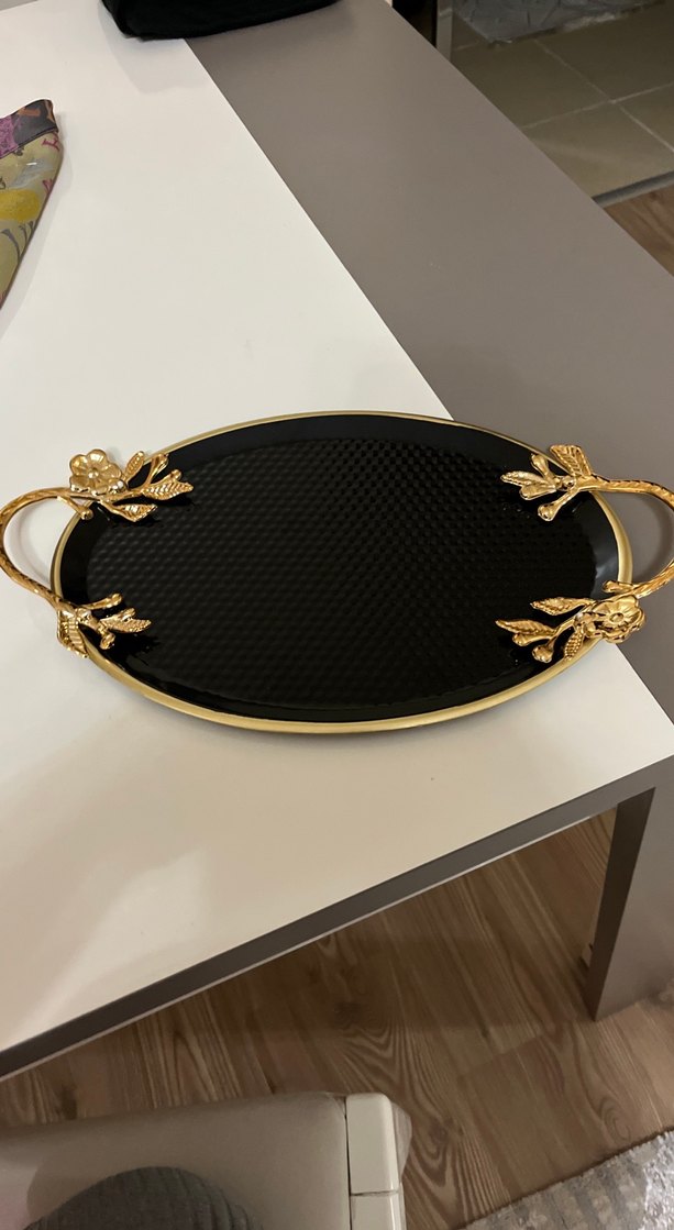 Modern klasik tarzda, siyah yılan desenli yüzeye ve yaprak şeklinde altın renkli kulplara sahip şık tepsi.