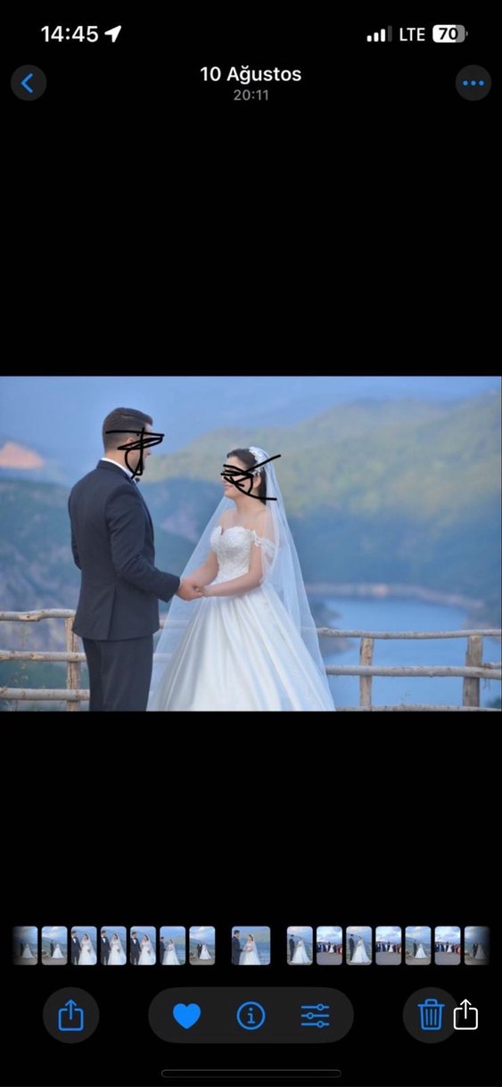 Bu dar kesim A-line gelinlik, straplez yaka ve ince askılarla tasarlanmıştır. Hafif beyaz renkte, modern klasik ve minimalist stilde midi boydadır.