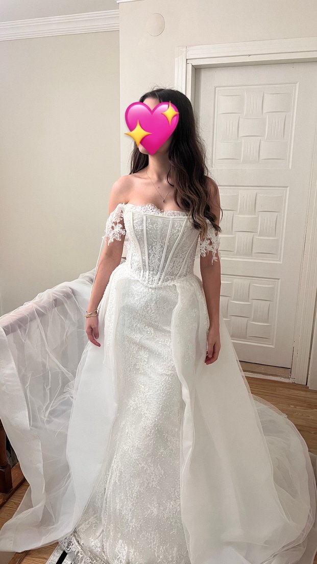 İnce dantel ve taş detayları ve askılı omuzlarıyla şık bir görünüm sunar. İki şekilde giyilir, kol kısmı çıkabiliyor. Bir kere giyildim herhangi bir sorunu yoktur. Temizdir. Duvağım tacım ve çiçeğimle beraber gönderim sağlayacağım. 55 kiloyla giydim fakat 50-65 kiloya kadar gidebilir. 36/38 beden giyilir. Pazarlık durumu vardır.
