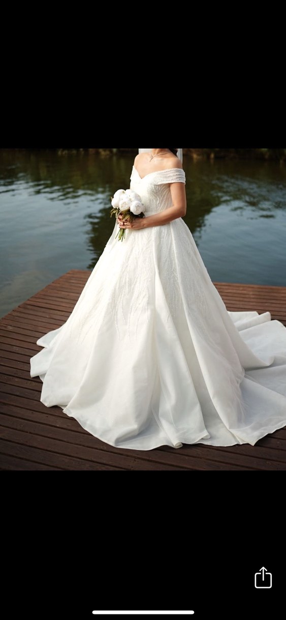 Uzun beyaz gelinlik, straplez yaka ve kısa kollu, modern klasik tarzda, bol kesimle sade ve şık bir görünüm sunar.