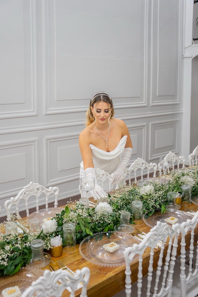 Beyaz renkli, straplez yaka ve ince askılı uzun boy A kesim gelinlik, modern klasik tarzı Paris şıklığıyla buluşturuyor. Normal kesim ve şık detaylar sunar.