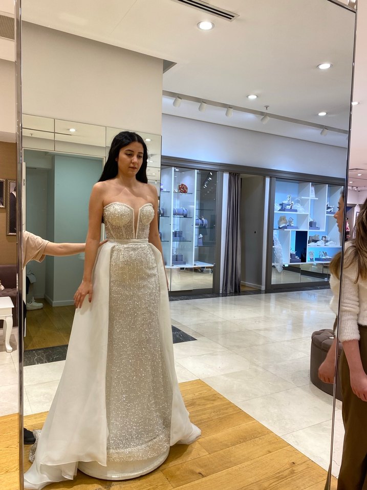 Uzun beyaz balık kesim gelinlik, straplez ve vücuda oturan tasarımıyla modern klasik tarzı yansıtıyor. Parlak detaylara sahip ve kolsuzdur. Bir kere giyilmiştir. Temizdir. Oleg Cassini Marka(53 kg s beden)