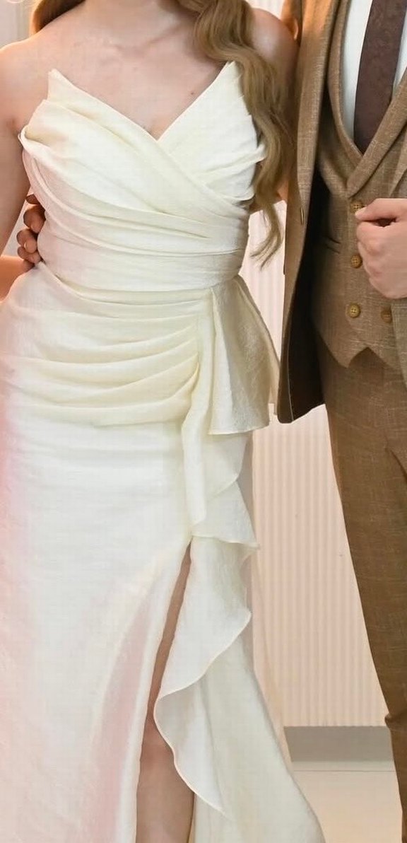 Uzun, straplez ve vücuda oturan bu beyaz gelinlik, zarif drapeli detaylarıyla klasik Paris tarzını yansıtıyor.