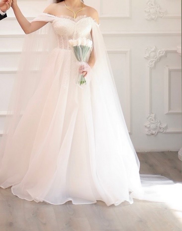 Modern ve klasik tarzın birleştiği, straplez ve uzun etekli beyaz gelinlik, minimal şıklık sunar. Oturmalı kesimi ve omuzları açık tasarımıyla dikkat çeker. Kollarını ister omuzda isterseniz askılı olarak kullanabilirsiniz özel dikim gelinliktir. 34-36 beden içindir boy kısmı 1.56-1.60 için idealdir tarlatansız ve yıkamaya verilmemiştir etek kısmının fotosu ekte yıkamaya verebilirsiniz