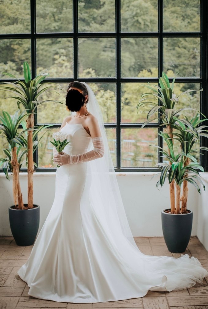 Bu beyaz gelinlik, straplez yakası ve kolsuz tasarımıyla modern klasik ve minimalist şıklığı birleştirir. Uzun boylu ve balık modeldir.