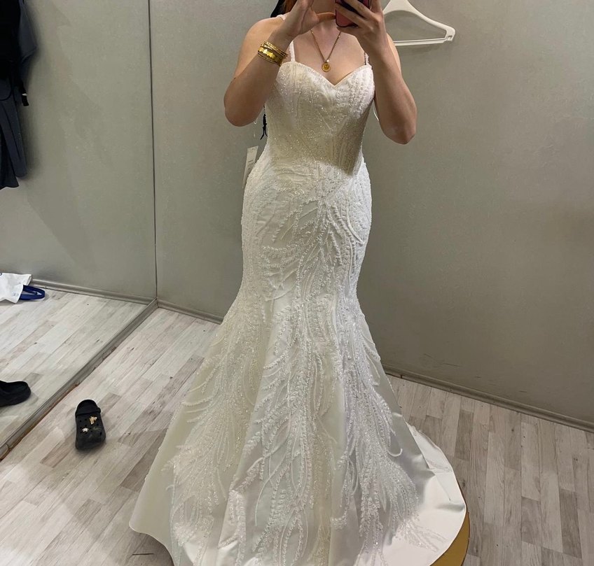Beyaz, uzun ve vücuda oturan straplez denizkızı gelinlik. İnce askılı kolları ve modern klasik tarzıyla şık ve gösterişli bir tasarım sunar.