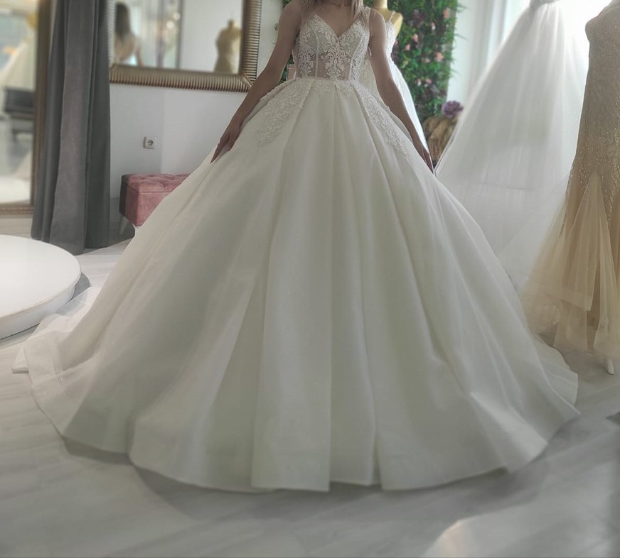 Modern klasik tarzda, straplez ve oturan kesim prenses gelinlik, uzun ve gösterişli etek ile zarif dantel detaylara sahiptir. özel dikim