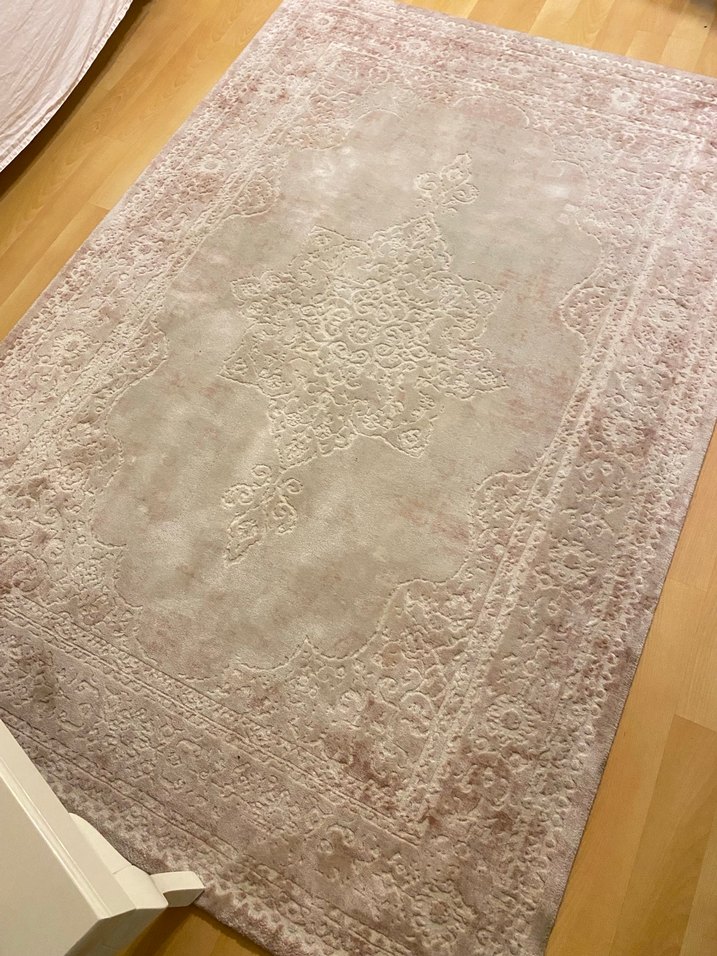 Modern klasik tarzda, pastel tonlarda bej renkte, hafif kabartmalı desene sahip şık halı. Ölçüsü 2.30-1.55