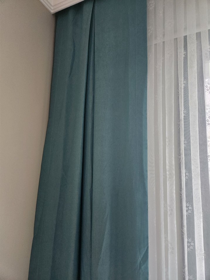 Modern klasik tarzda, düz turkuaz i renkte, şık ve sade bir perde. Çift kanat, uzunlık 263cm
