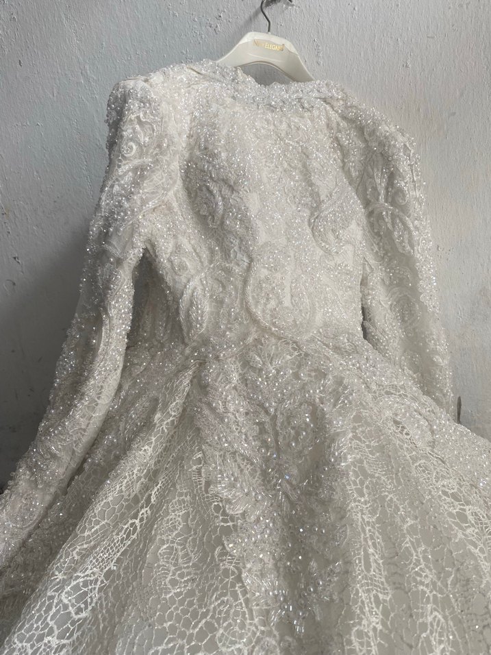 Bu dar kesim prenses gelinlik, yuvarlak yaka ve uzun kollu tasarıma sahiptir. Modern klasik stil, detaylı boncuk ve dantel işçiliğiyle göz alıcı bir görünüm sunar. Beyaz renktedir ve uzun boydadır.