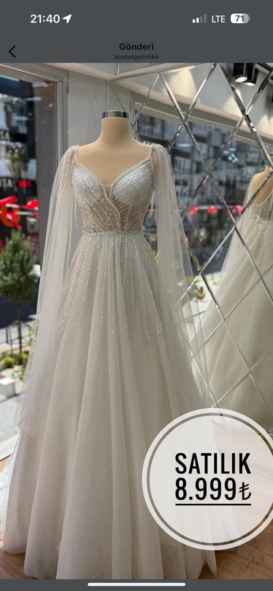 Kolsuz, V yakalı, uzun A kesim beyaz gelinlik, modern klasik zarafeti yansıtan ince boncuk detaylarıyla süslenmiştir. ✨