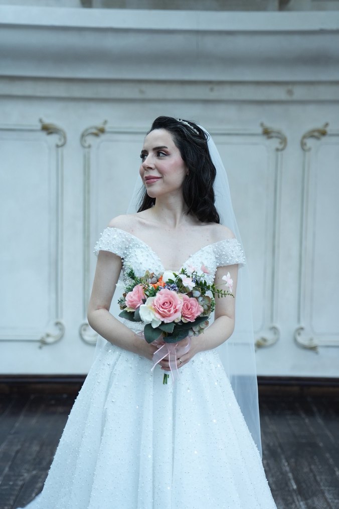 Bu beyaz A kesim gelinlik, V yaka ve kısa kollu olup modern klasik tarzda, normal kesimdir. Düğünler için hafif ve zarif bir görünüm sunar.