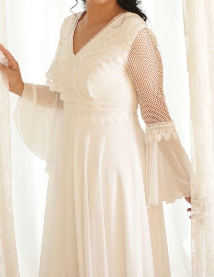 V yaka ve askılı kollara sahip beyaz midi gelinlik, modern klasik tarzı Paris şıklığıyla buluşturuyor. Rahat kesimiyle zarif bir düğün görünümü sunar.
