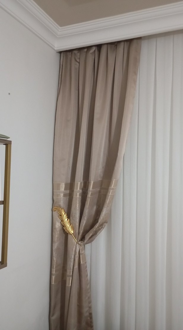 Parlak bej renkte, yılan desenli modern klasik tarzda perde. Zarif pileler ve hafif parlak yüzeye sahiptir.