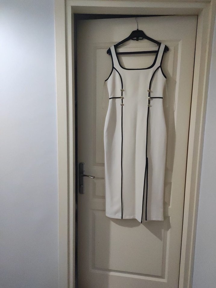 Zara markadır.Uzun, kadın elbise modern klasik tarzdadır. Hiç giyilmemiştir. Etiketlidir. M bedendir. Boyu 119 cm, göğüs ölçüsü 37 cm, kol oyuntusu 22 cmdir.