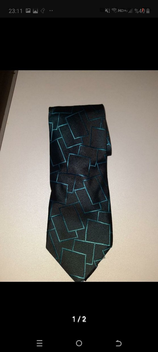 Bu erkek kravatı, koyu mavi zemin üzerinde çağdaş geometrik desenlere sahip, şık bir iş görünümü için idealdir.