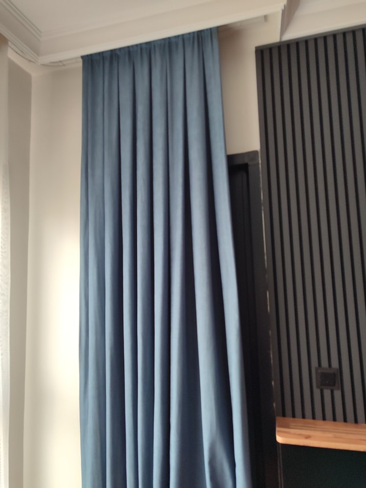 Gri iç mekanlara uyum sağlayan, düz ve desen içermeyen modern mavi fon perde. Her odaya sakin ve şık bir hava katar.