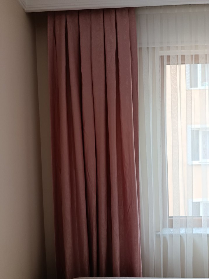 pudra rengi 1/3 sık pile en 70 cm boy 250 cm soft kumaş 2 adet fon perde.1 tanenin alt ic kisminda ve yan duvara gelen kisminda hafif bir boya lekesi var .cikabilecek bir leke.cok az kullanildi ütü yapmaniz gerekir.