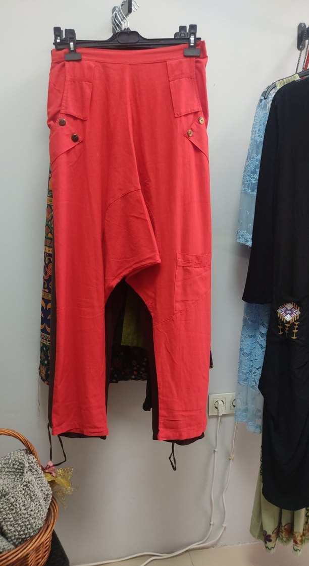 Modern şalvar. Düğmeli detaylara sahip kırmızı midi uzunlukta, bol kesim kadın kumaş pantolon. Rahat günlük kullanım için yumuşak tekstil malzemeden üretilmiştir.