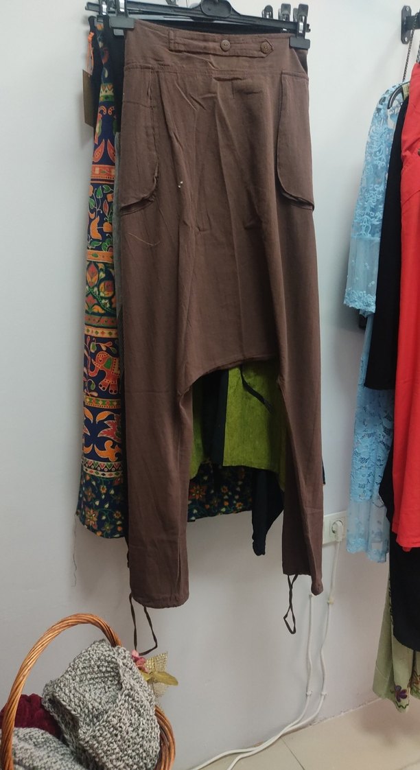 Modern şalvar. Bohem tarzda, uzun, kahverengi, dokuma kumaşlı, bol kesim ve drapeli kadın pantolonu. Günlük kullanıma uygundur.