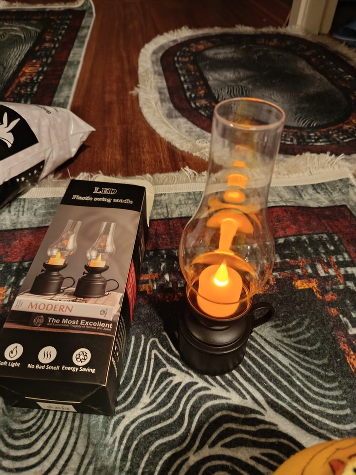 Modern siyah LED fener lambası, şeffaf cam fanus ve sıcak ışık yayar. Enerji tasarruflu ve kötü koku yapmaz. ️
