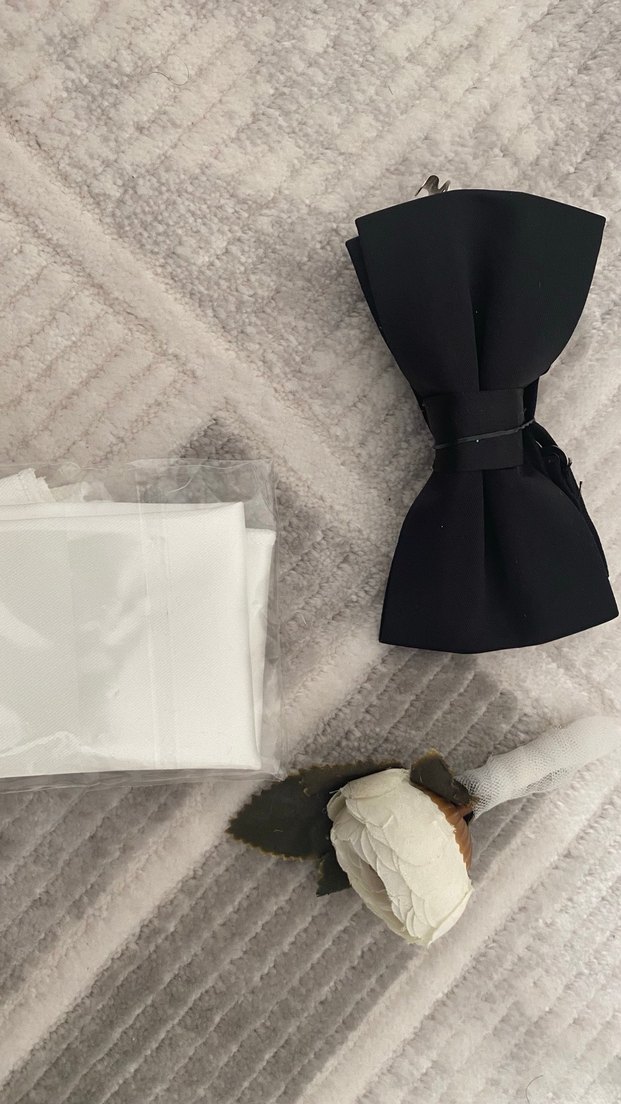 Modern siyah papyon ve beyaz mendil seti, şık ve deseniz tasarımıyla