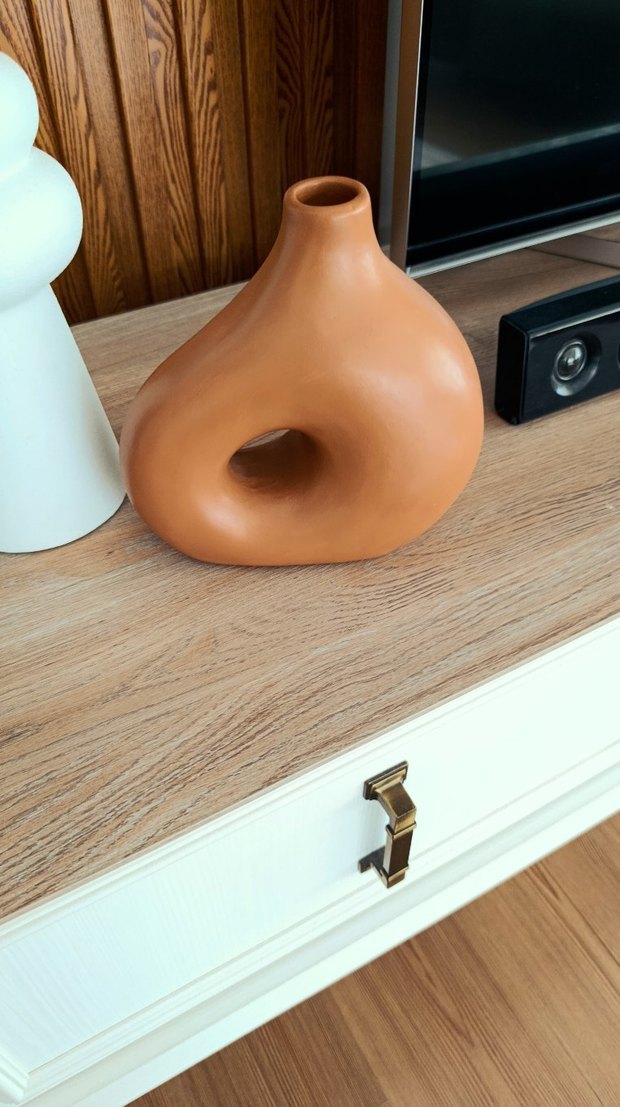taba renkte, modern ve boşluklu tasarıma sahip vazo. Pürüzsüz yüzeyiyle mekana sade bir dokunuş katar. Sadece alt kısmında boya atması var.Çok küçük belirsiz.Çatlak kırık vs.kesinlikle yok