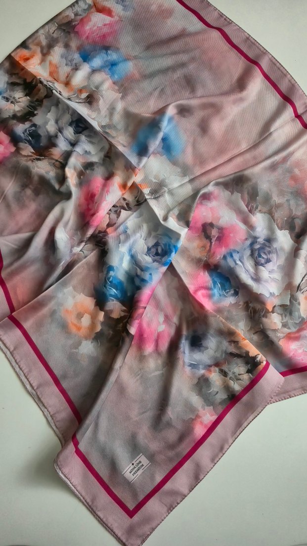 Kadınlar için çok renkli çiçek desenli, gri tabanlı, dökümlü tasarıma sahip sentetik kumaştan modern ve şık fular. #çiçek#şal#pembe#mavi