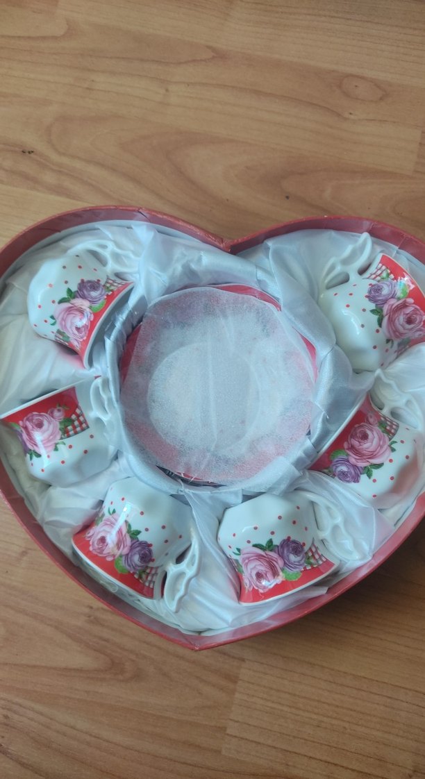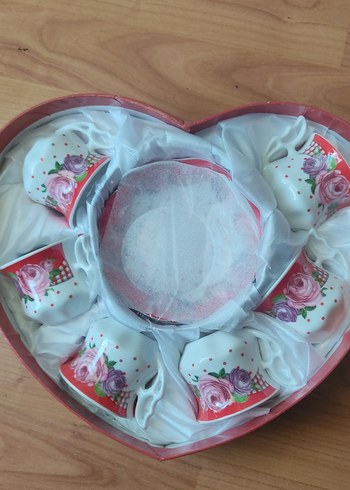 Modernic kahve fincan takımı, floral desenlerle süslenmiş pastel pembe kalp şeklinde kutuda sunulmaktadır. ☕hiç kullanılmadı.
