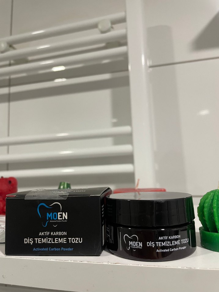 Moen aktif karbon diş temizleme tozu, lekeleri ve kirleri etkili şekilde giderir. Siyah küçük kutu ve kavanozda sunulur.
