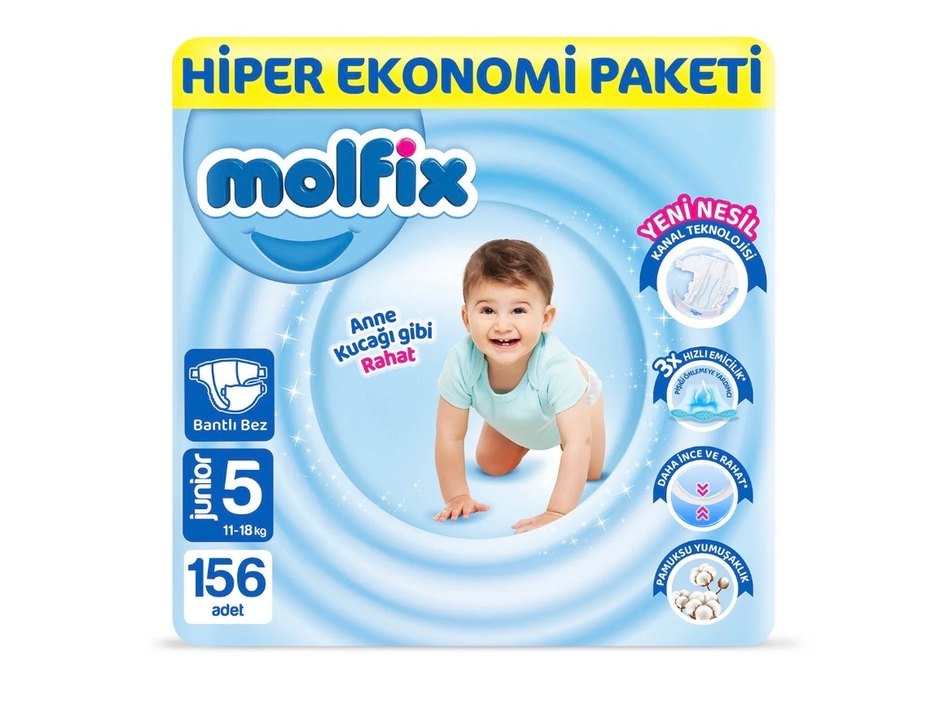 Molfix 5 numara bebek bezi 11-18 kg arası bebekler için anne kucağı gibi rahatlık sağlar. 156 adet, hızlı emici ve yumuşak yapıya sahiptir.