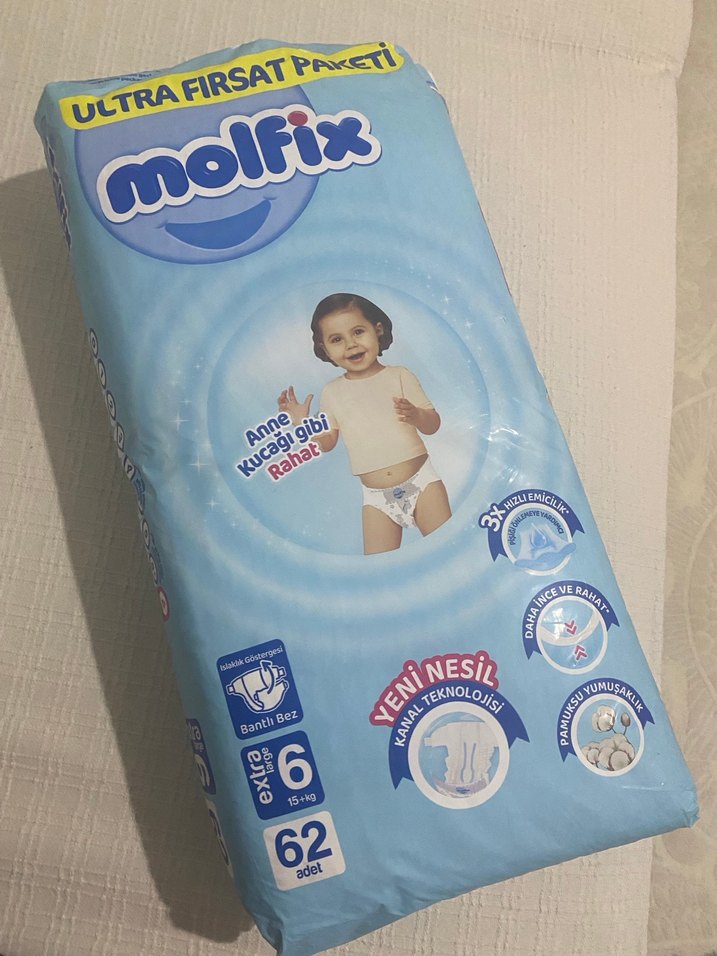 Molfix 6 numara 62 adet bebek bezi, 15-19 kg arası bebekler için yeni nesil teknolojili, rahat ve kuru kullanım sağlar.