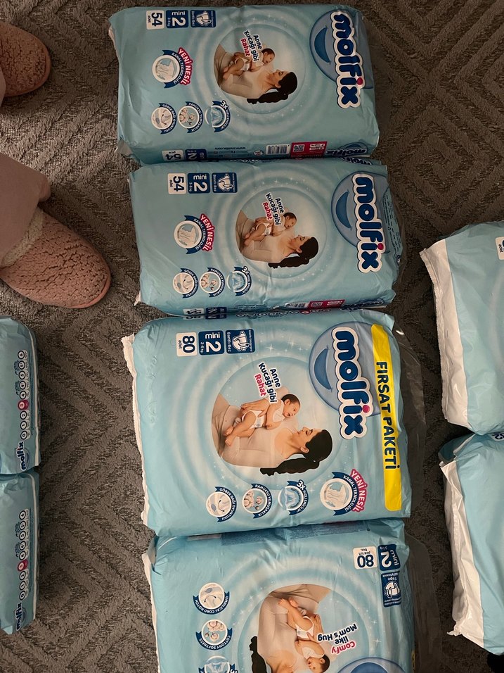 Molfix Mini bebek bezleri, 3-6 kg bebekler için 54'lü paket halinde ve 80 li . Yumuşak, yüksek emici ve cilt dostudur. Çok uyguna koyuyorum toplam 270 adet bez var