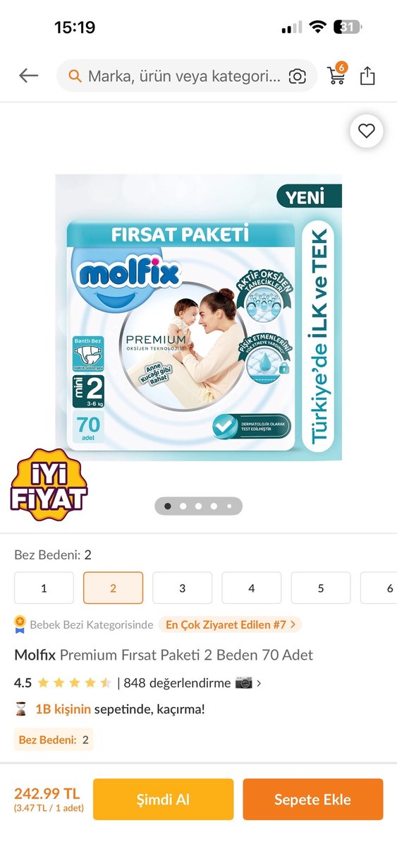 Molfix Premium 2 beden 70 adet bebek bezi, aktif oksijen teknolojisi ile cilt dostu bakım sunar.