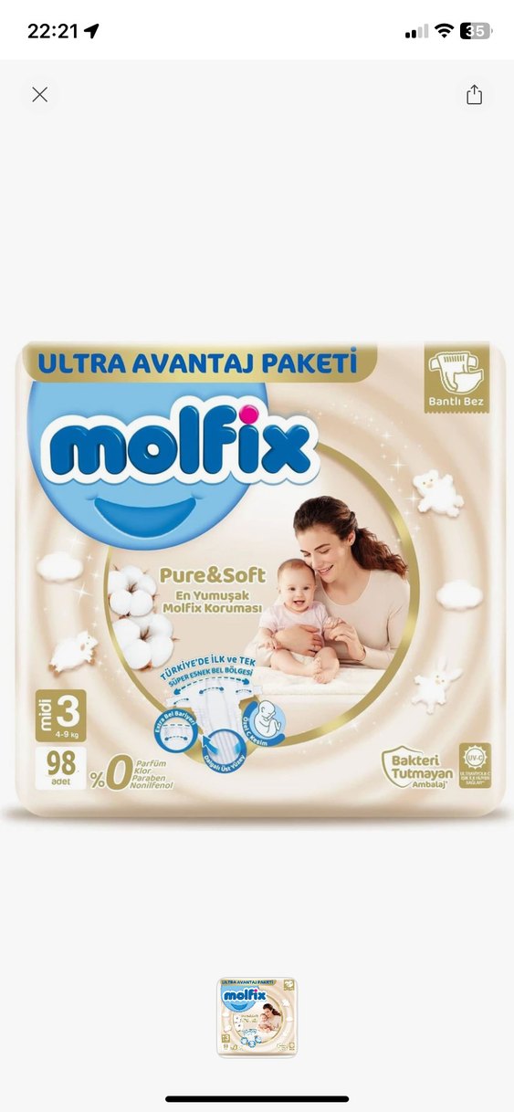 Molfix Pure & Soft bebek bezleri, yumuşak ve koruyucu tasarıma sahiptir. Antibakteriyel ambalajda, 4-9 kg bebekler için 98 adet midi boy bez içerir. Hiç açılmamış 2 paket mevcut yani 98x2=196 adet mevcuttur isteyen tek paket olarakta verebilirim