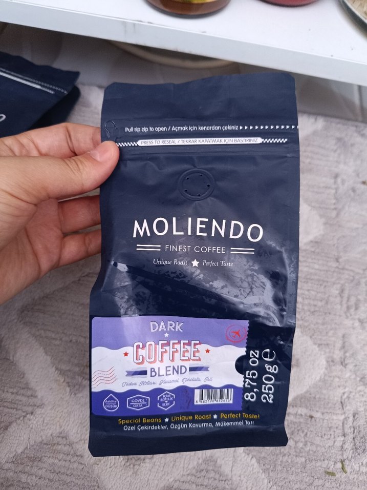 Moliendo Dark Coffee Blend, 250 g koyu lacivert paket içinde, özel çekirdekler ve eşsiz kavurma ile mükemmel tat sunar. ☕