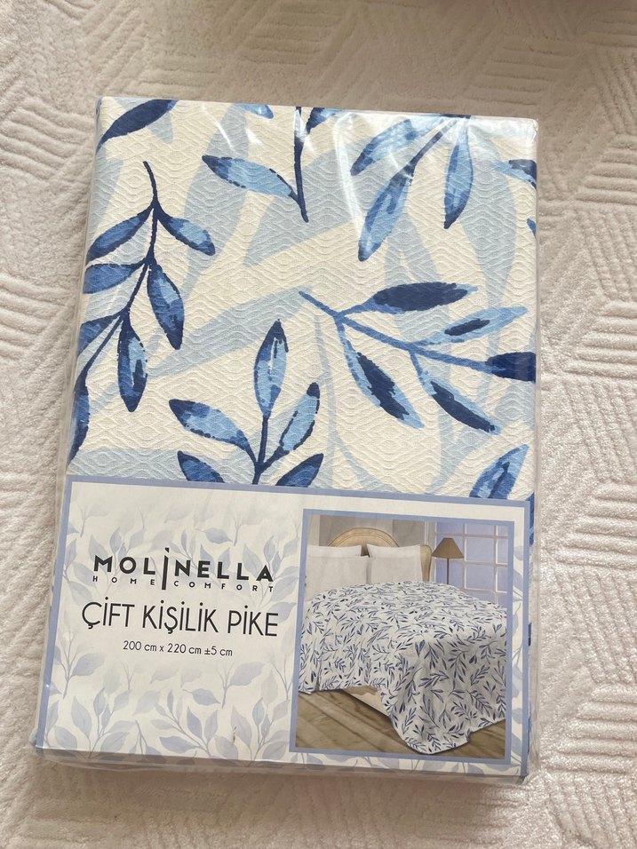 Molinella çift kişilik pike, açık mavi yaprak desenli ve 200x220 cm ölçülerindedir, 55 cm bordürlü.