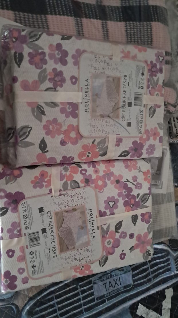 Molinella marka, pastel pembe çiçek desenli pike ve çarşaf takımı, yumuşak ve konforlu bir dokunuş sunar.