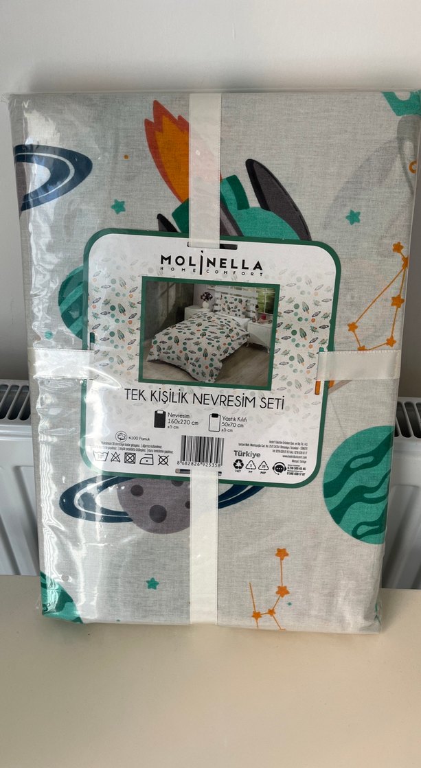 Molinella markasının tek kişilik, renkli baskılı, gri sentetik kumaştan yapılmış nevresim seti, çocuk yataklarına neşeli bir dokunuş katar.